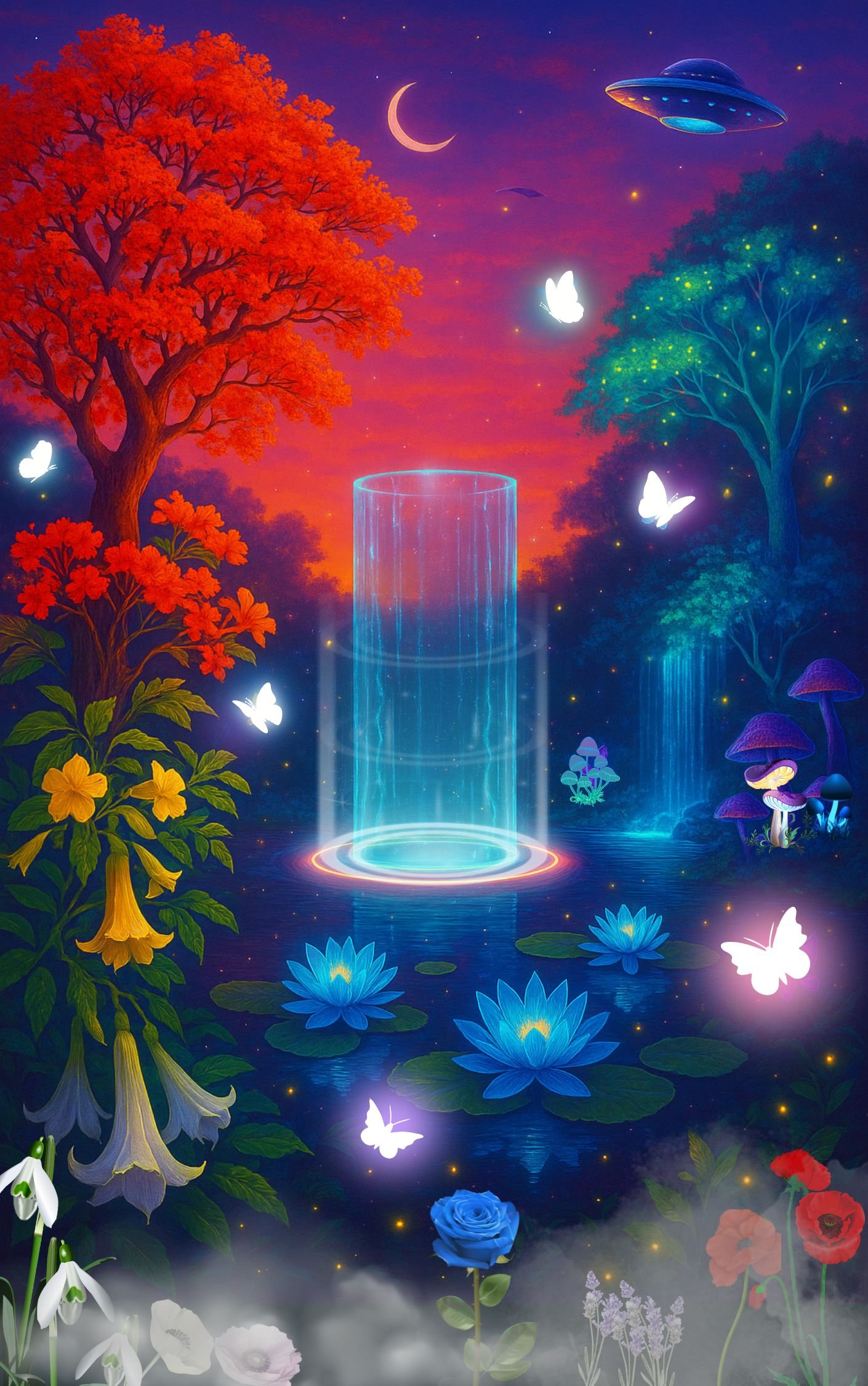 The garden is a landscape in perpetual twilight, with a mystical, aphrodisiac mist, full of bioluminescent butterflies, psilocybin mushrooms, psychoactive flowers sensitive to touch, and crystalline trees that respond to pleasure. In its center floats a cylinder of liquid light, discovered by Karael, which functions as an altar, transporter, and amplifier.