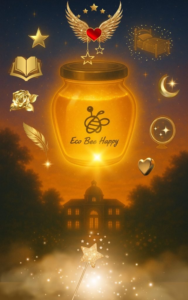 El frasco Bee Happy es un recipiente transparente con tapa de metal dorada, decorado con una etiqueta sonriente y vibrante que lleva el mensaje: “Bee Happy”. Fue creado por Karael como herramienta simbólica para guiar, de manera espontánea y ligera, las visitas a las habitaciones de Our Place. Dentro contiene papelitos numerados del 1 al 16, cada uno correspondiente a una de las habitaciones simbólicas principales del templo interdimensional.